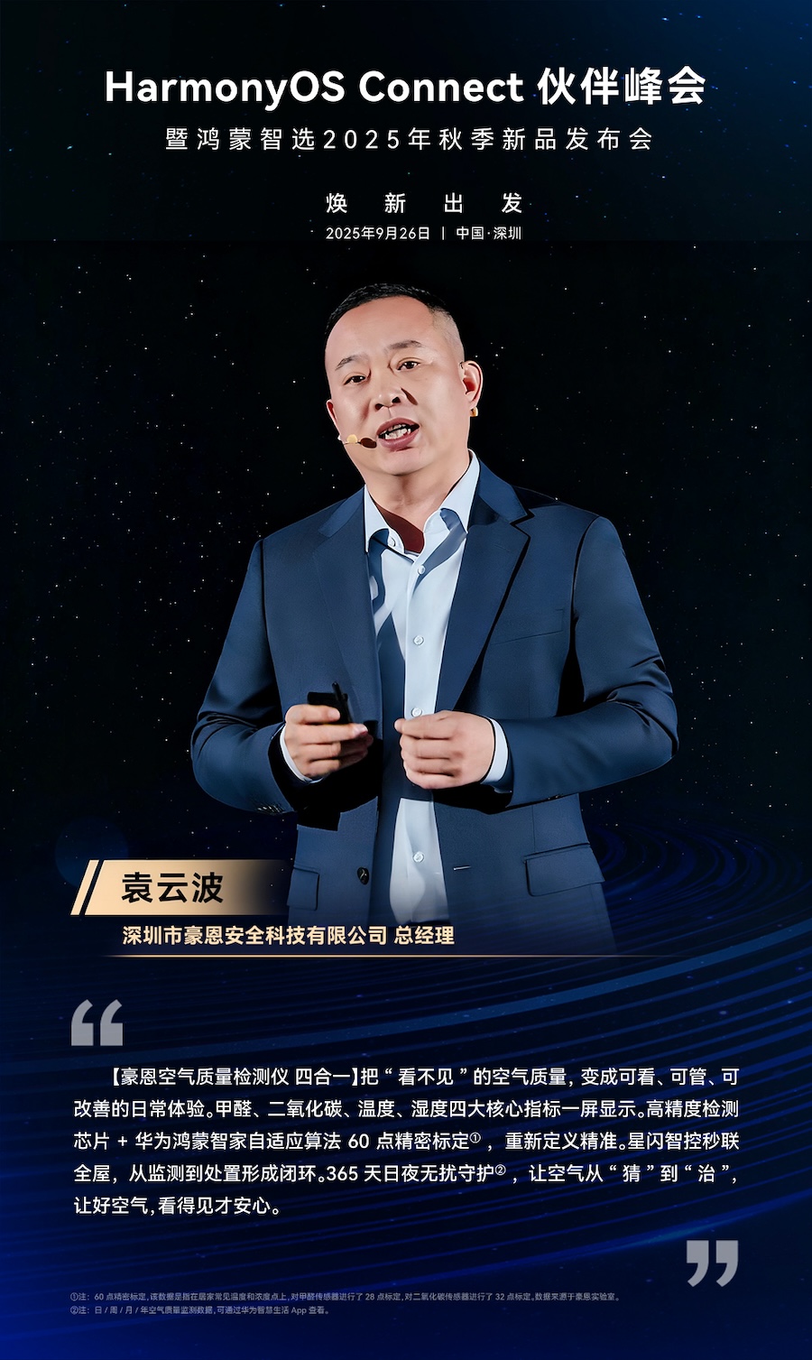 作为首批加入鸿蒙智选的生态合作伙伴之一,中安科全资子公司深圳市豪恩安全科技有限公司(下文简称豪恩)推出全新智能家居产品——鸿蒙智选 豪恩空气质量检测仪。豪恩总经理袁云波代表公司发表演讲,中安科集团副总裁胡刚莅临现场,共同见证。